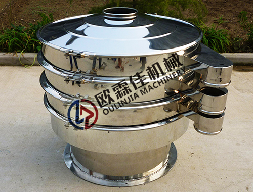 1層式旋振篩安裝1個目數的篩網(例80目),有兩個排料口(上排料口排粗料,下排料口排細料),依次2層安裝2個目數的篩網(例80目、100目)三個排料口,上圖為3層旋振篩,可同時篩分出四種大小不同規格的物料。